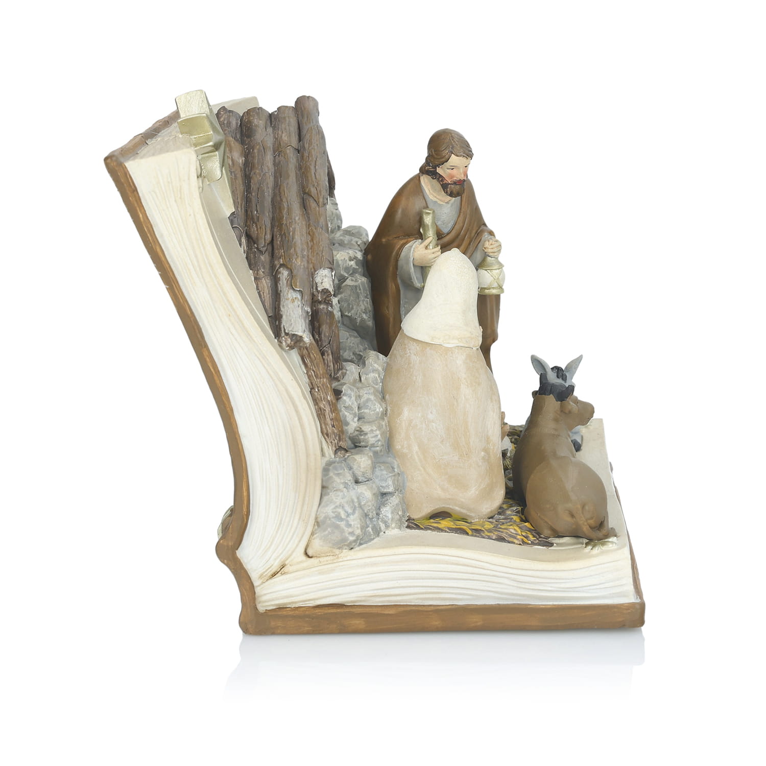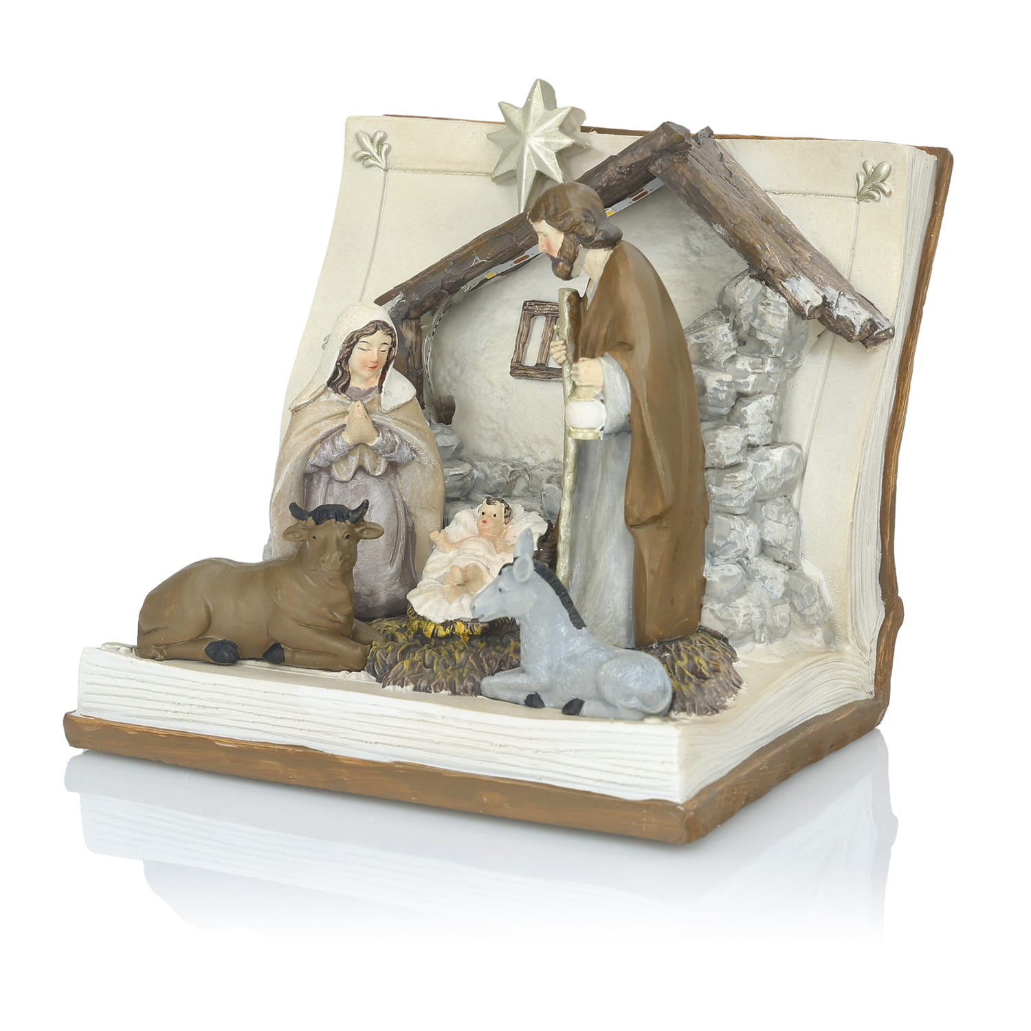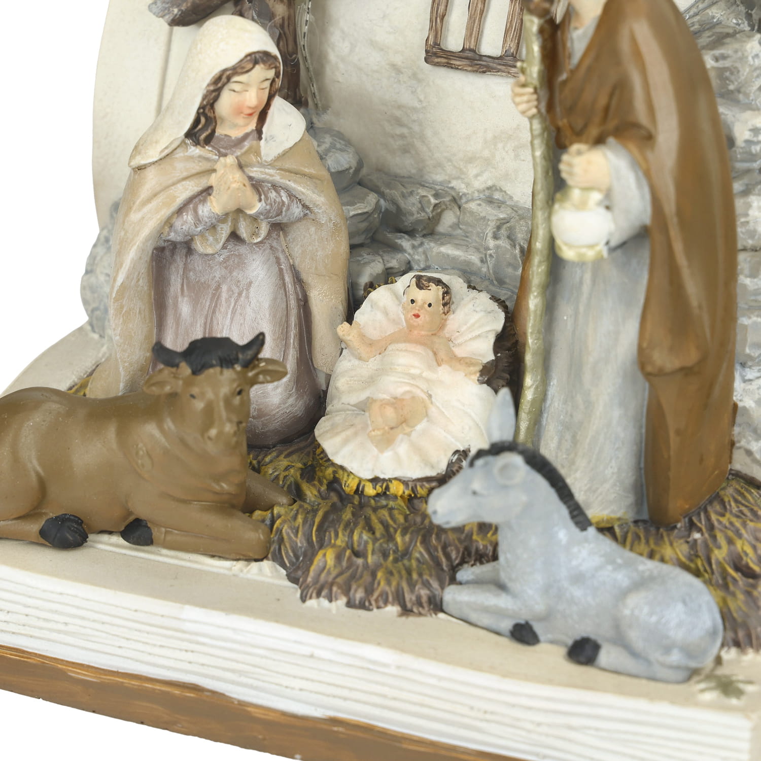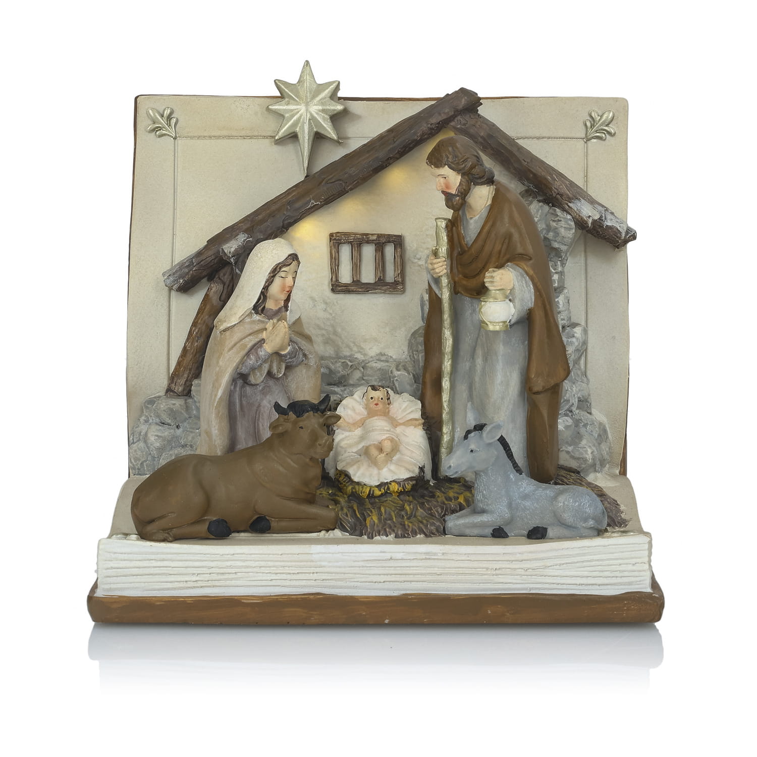 Szopka wykonana z żywicy, ręcznie malowana, posiada lampki LED, które od tyłu oświetlają postacie.