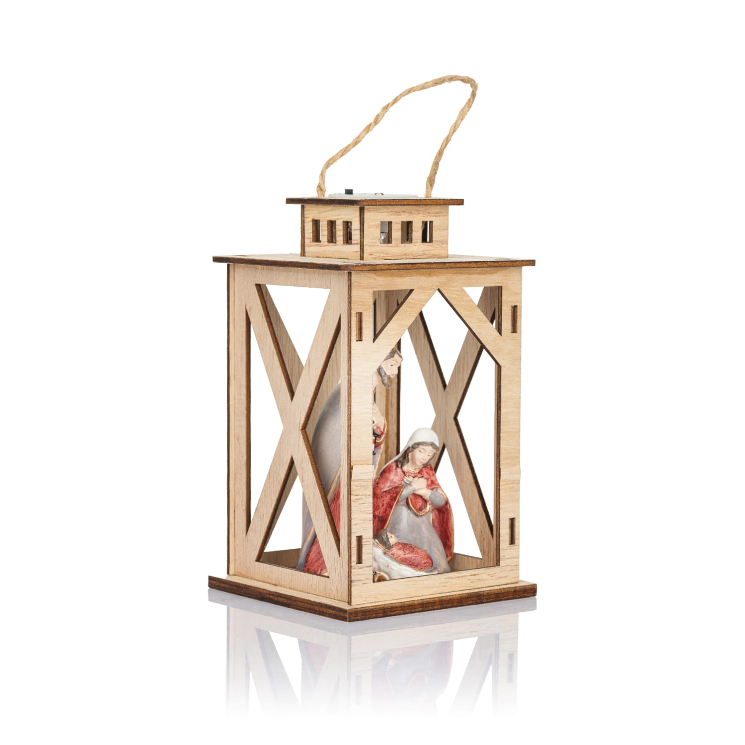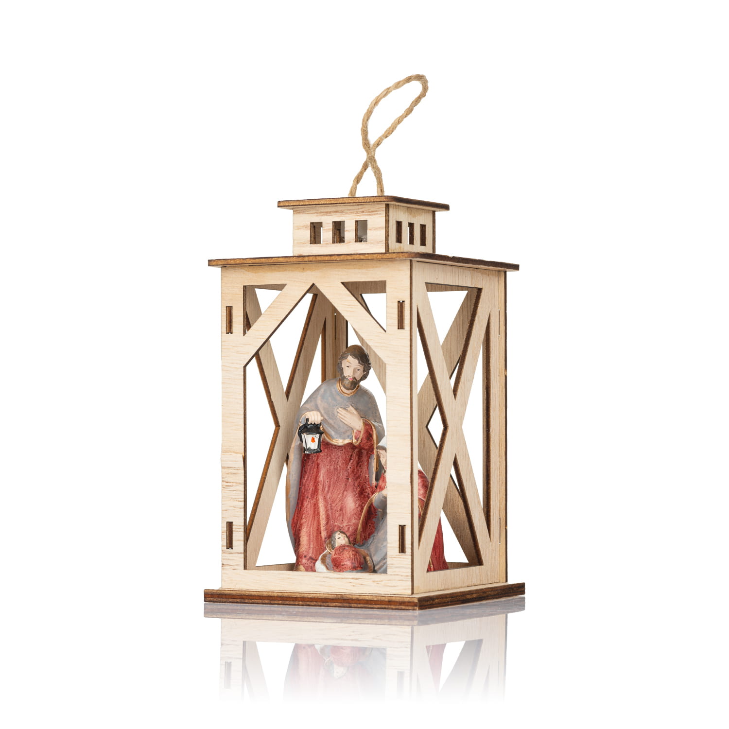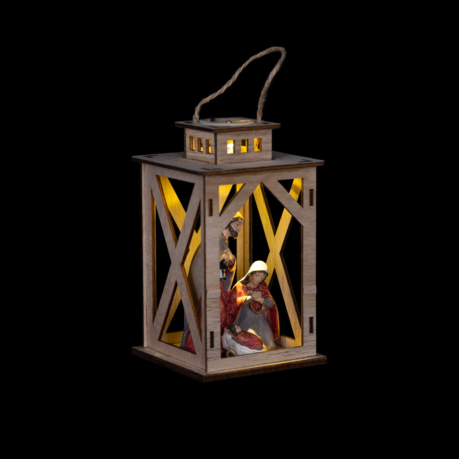 Szopka Bożonarodzeniowa przedstawiająca Świętą Rodzinę  umiejscowiona w drewnianym lampionie.